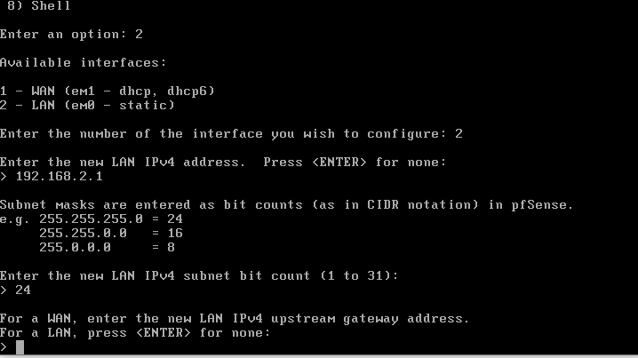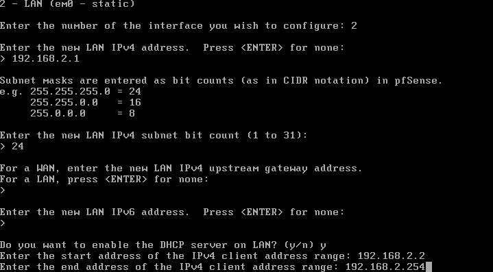 2 ->192.168.2.1 -> 24 -> 엔터 -> 엔터 -> y -> 192.168.2.2 -> 192.168.2.254 -> 엔터