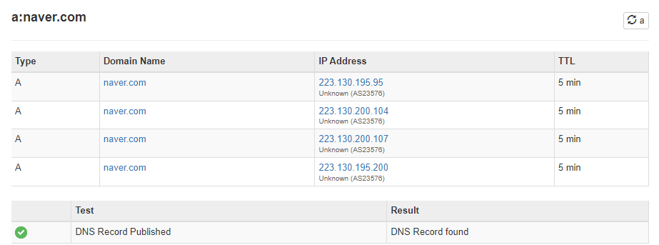 네이버의 경우 TTL 이 5min 이므로 5분간 캐시된다고 볼 수 있습니다.