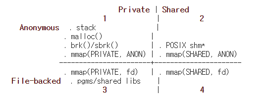 - 사용 중 및/또는 예약된 모든 항목( 모든 사분면) 참고 : 프로그램 이미지와 공유 라이브러리는 프로세스의 비공개 로 간주 되지만 커널에서는 공유 (SHR) 로 간주됩니다