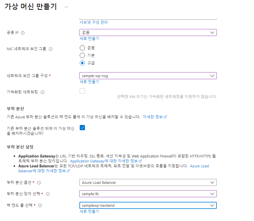 공용ip는 없음, 네트워크 보안그룹 구성, 부하분산 체크해서 만들었던거 입력하자