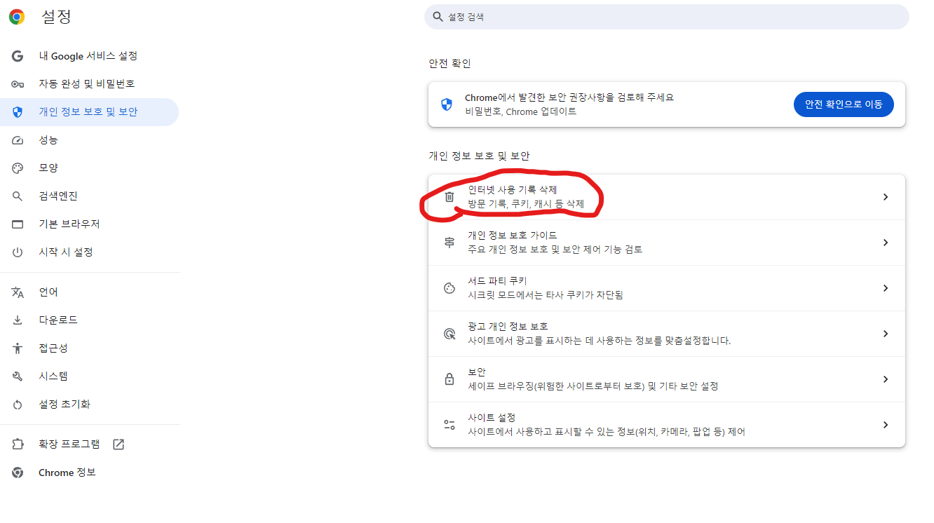 크롬에서 설정- 개인정보 보호 및 보안 - 인터넷 사용 기록 삭제 - 쿠키및 기타사이트 데이터, 캐시된 이미지 및 파일 삭제