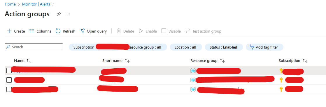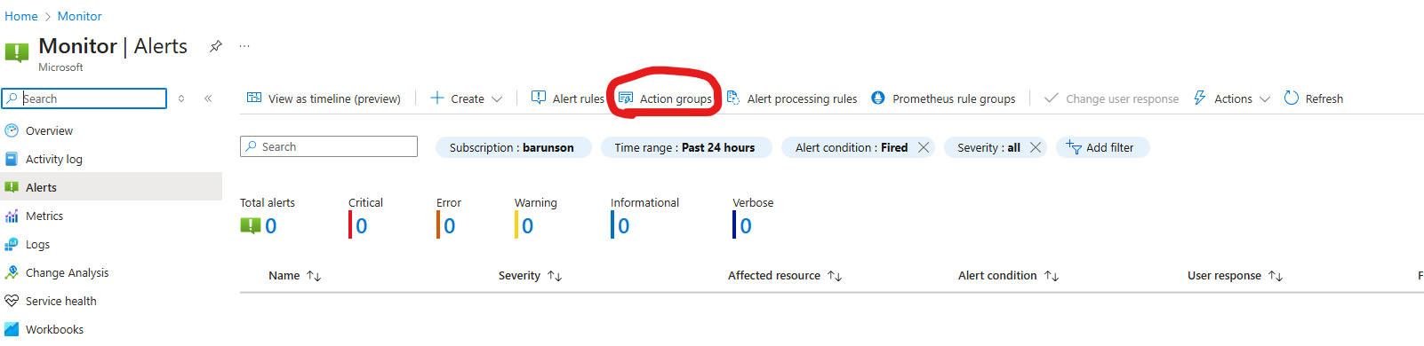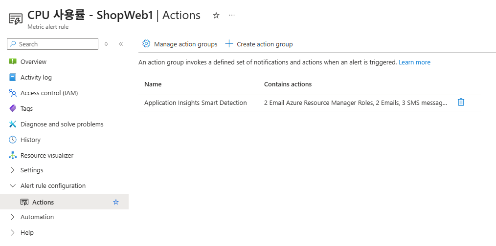 azure 콘솔 검색에서는 action groups 해도 안나온다. monitor alerts에서 들어가서 할수만 있음