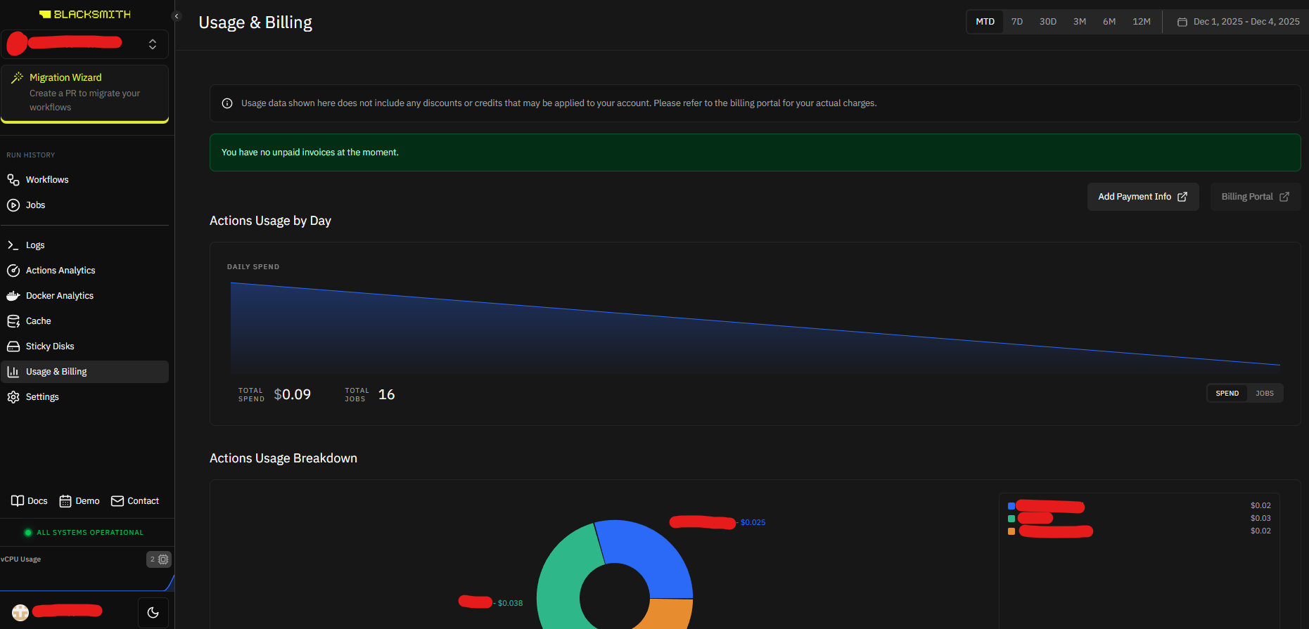 - 과금 주체는 GitHub의 billing이 아니라 Blacksmith 자체 청구 시스템
