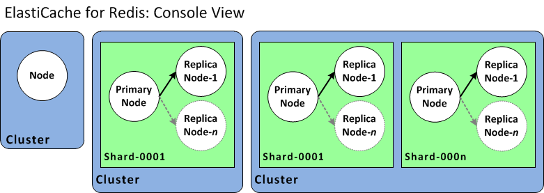 다음 다이어그램은 콘솔의 관점에서 바라본 ElastiCache for Redis 클러스터의 다양한 토폴로지를 나타낸 것입니다.
