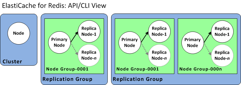 ElastiCache API 및 AWS CLI 작업에서는 여전히 단일 노드 ElastiCache for Redis 클러스터를 다중 노드 복제 그룹과 다른 것으로 식별합니다. 다음 다이어그램은 ElastiCache API 및 AWS CLI 관점에서 바라본 다양한 ElastiCache for Redis 토폴로지를 나타낸 것입니다.