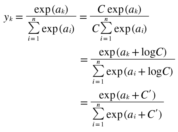 exp는 전에 말했던대로 지수함수 이고 n은 출력층의 뉴런수, yk는 그중 k 번째 출력이라는 뜻이다.