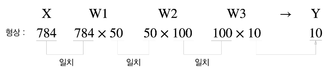 이 신경망은 입력층 뉴런 784개, 출력층 뉴런 10개로 구성된다.