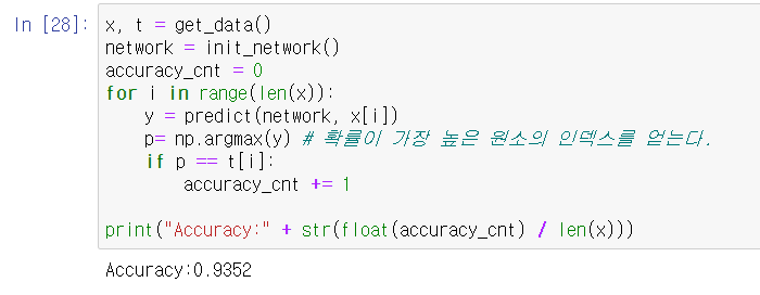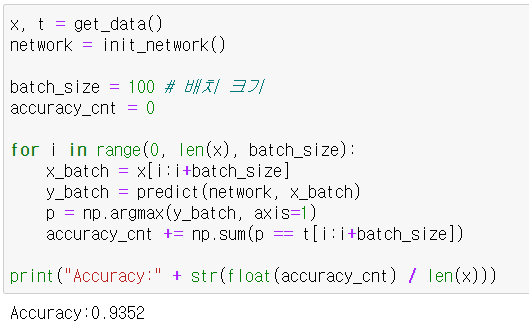 마지막으로 예측한 답변과 정답레이블을 비교하여 맞춘 숫자를 세고 이를 전체 이미숫자로 나눠 정확도를 구한다.
