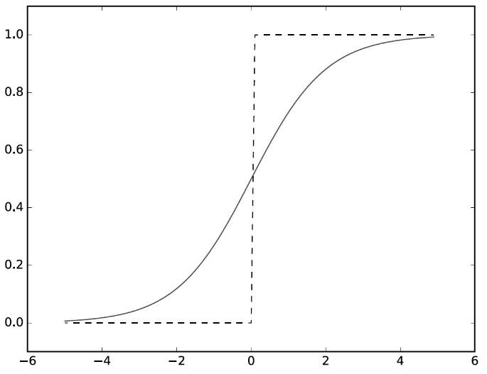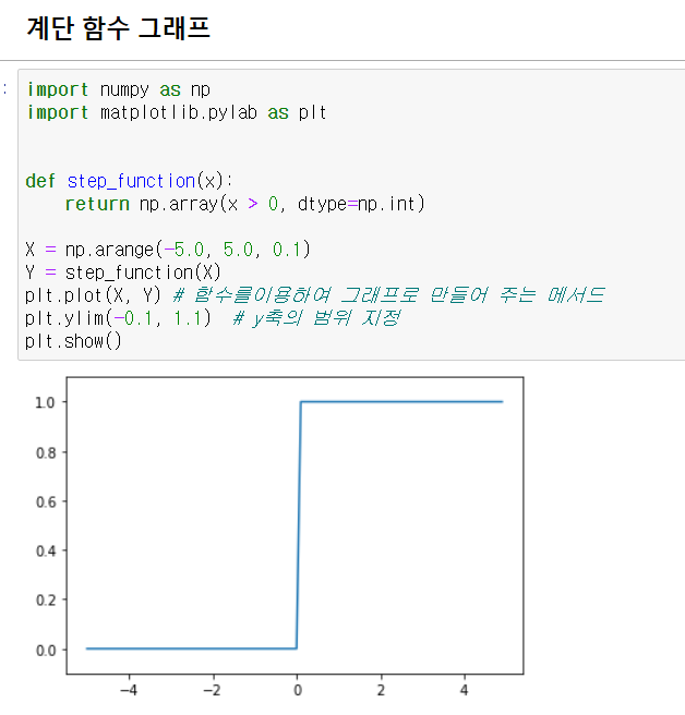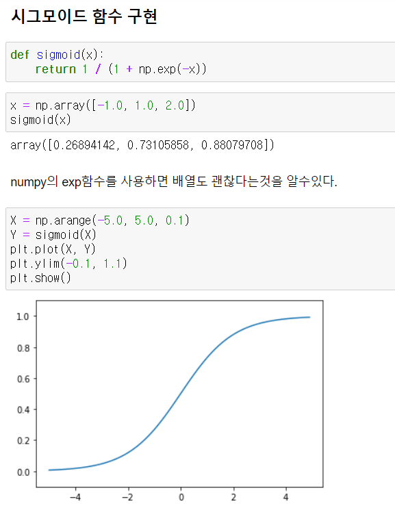 모양은 같으나 계단함수는 비연속, 시그모이드는 연속함수라는 것을 알 수 있다.