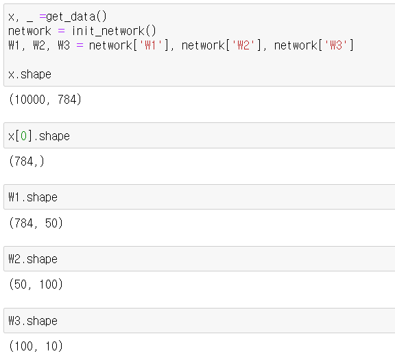784개인 이유는 이미지 크기가 28X28=784, 10개인 이유는 출력숫자가 0~9까지 있기 때문이다.