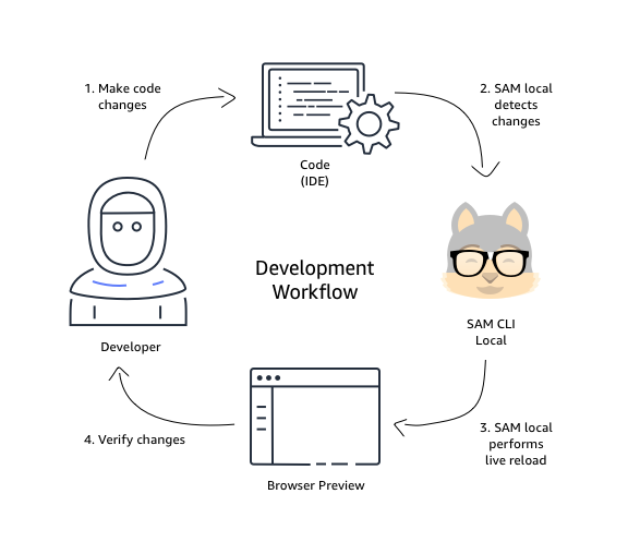 이제 SAM 응용 프로그램이 있습니다. AWS SAM CLI를 사용하여 로컬에서 실행하고 테스트하는 방법을 배우게 됩니다. 이는 일상적인 개발 워크플로의 일부이기 때문에 중요합니다. 애플리케이션이 예상대로 작동하는지 확인하고, 무엇이 잘못되었는지 디버그하고, 변경 사항을 중앙 저장소로 푸시하기 전에 문제를 수정하는 데 도움이 됩니다.