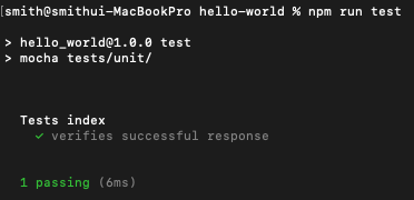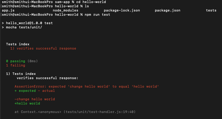 터미널의 sam-app/hello-world 폴더에서 다음 명령을 실행하여 단위 테스트를 실행합니다.