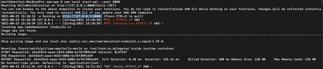 SAM이 Docker 컨테이너 이미지 lambci/lambda:nodejs12.x를 자동으로 가져오는 방법에 유의하십시오. 이것이 SAM이 Lambda 런타임을 로컬로 시뮬레이션하고 그 안에서 함수를 실행할 수 있는 방법입니다. 첫 번째 호출은 docker pull 명령으로 인해 몇 초가 걸릴 수 있지만 후속 호출은 훨씬 빨라야 합니다.