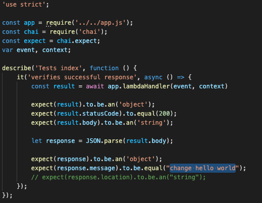 sam-app/hello-world/tests/unit/test-handler.js 파일을 열고 새 메시지와 일치하도록 응답에 대한 예상 값을 업데이트합니다. 업데이트 후 단위 테스트는 다음과 같아야 합니다.