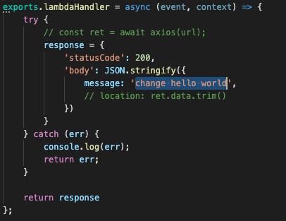 앱이 실행되는 동안 sam-app/hello-world/app.js 파일을 열고 간단한 코드 변경을 수행합니다. 예를 들어 hello world 대신 hello my friend를 반환하도록 응답 메시지를 변경합니다. 변경 후 Lambda 핸들러는 다음과 같아야 합니다.