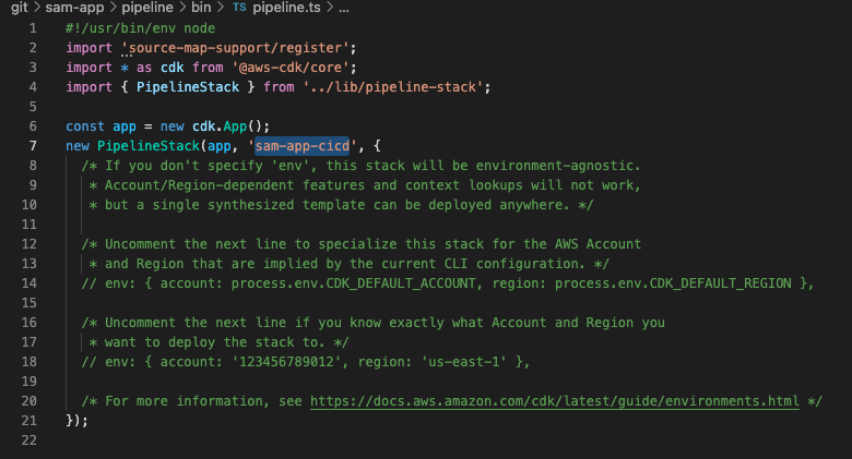 CDK 프로젝트의 entry-point인 bin/pipeline.ts 파일을 열고 스택 이름을 sam-app-cicd로 변경합니다.