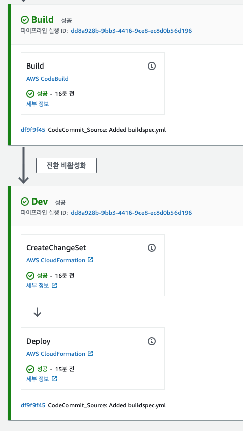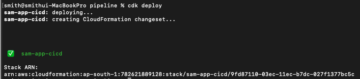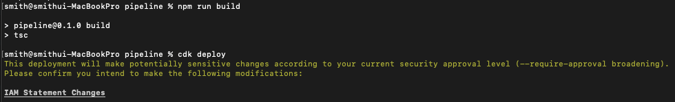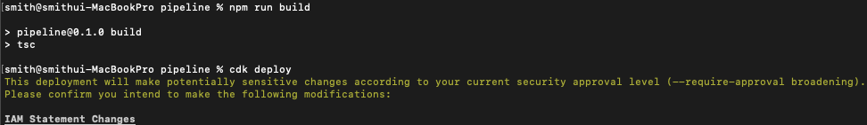 빌드가 완료되면 CDK CLI를 사용하여 파이프라인 프로젝트를 배포합니다.