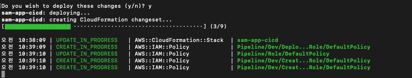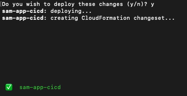 CLI는 배포하기 전에 변경 사항을 확인하도록 요청할 수 있습니다. (저같은 경우는 항상 물어봄..)이는 애플리케이션을 배포하는 IAM 역할에 관리자 권한을 부여하기 때문입니다. 이 역할은 사람이 아니라 CloudFormation에서만 맡을 수 있기 때문에 일반적으로 나쁜 습관은 아닙니다. 그러나 조직에 더 엄격한 보안 태세가 있는 경우 세분화된 정책으로 사용자 지정 IAM 배포 역할을 생성하는 것을 고려할 수 있습니다.