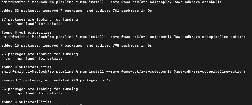 이제 파이프라인을 구축하는 데 사용할 CDK 모듈을 설치합니다.