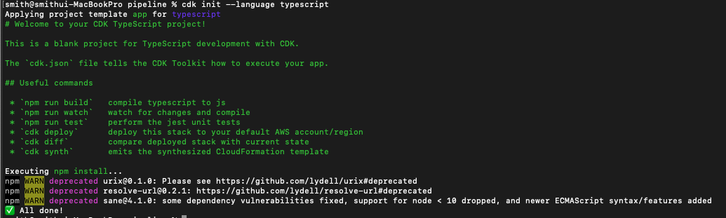 다음 명령을 실행하여 pipeline 폴더 내에서 새 CDK 프로젝트를 초기화합니다.