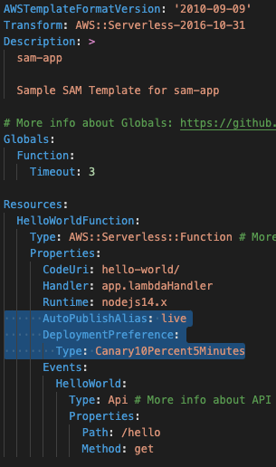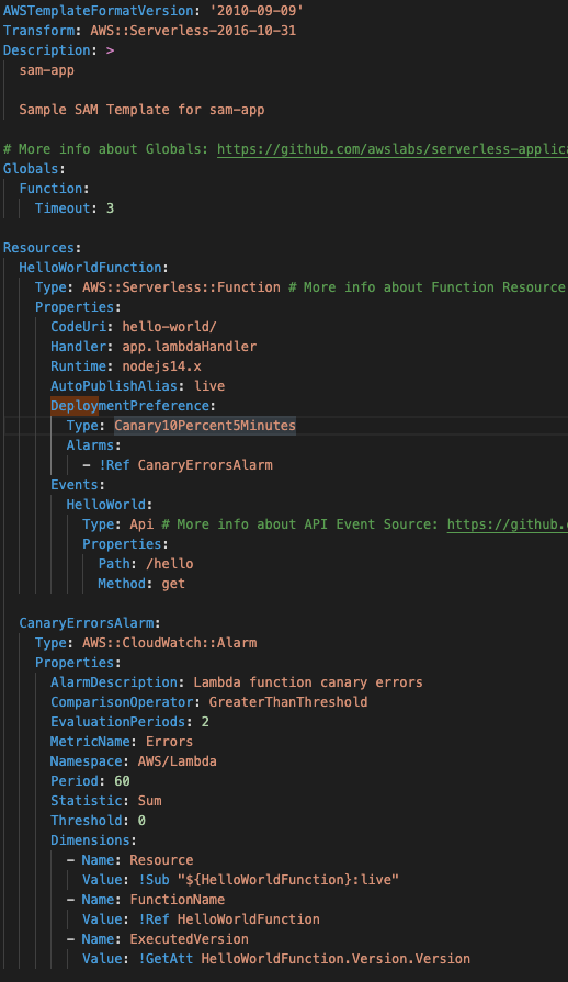 그런 다음 HelloWorldFunction 정의의 DeploymentPreference 섹션에 다음 줄을 추가합니다.