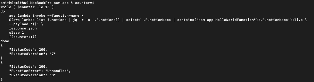 경고!: 배포하는 동안 트래픽의 10%만 새 버전으로 라우팅됩니다. 따라서 계속해서 람다를 여러 번 호출하십시오. 10번의 호출 중 1번은 롤백을 일으키려는 새로운 깨진 람다를 트리거해야 합니다.
