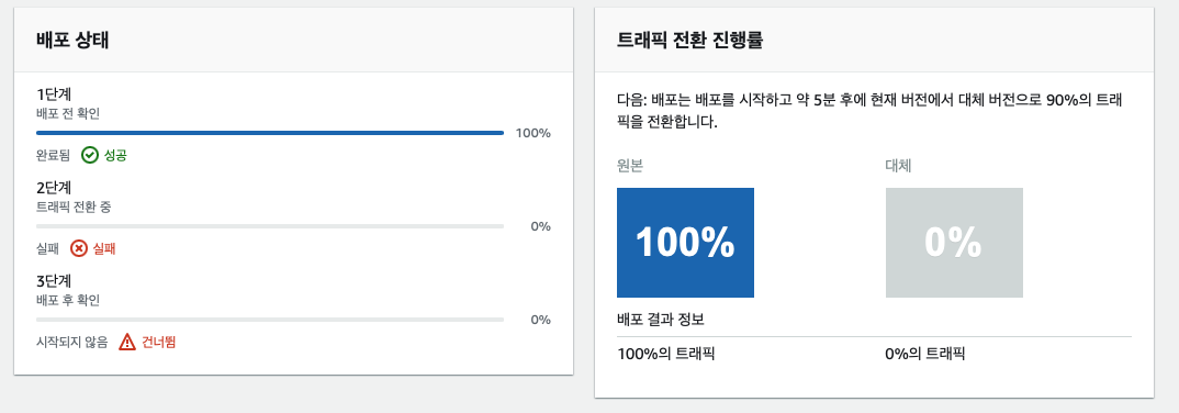 카나리아의 상태를 모니터링하면 CodeDeploy에서 롤백이 필요한지 여부를 결정할 수 있습니다. 지정된 CloudWatch 경보 중 하나라도 ALARM 상태가 되면 CodeDeploy는 배포를 자동으로 롤백합니다.