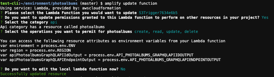 이 단계가 완료되면 Lambda 함수의 코드를 실행할 준비가 되었지만 작동하기 전에 구성 방식을 몇 가지 더 변경해야 합니다. Amplify가 업로드를 처리하기 위해 S3 Trigger 함수를 처음 생성했을 때 S3 버킷의 파일에 액세스할 수 있는 Identity and Access Management 권한이 있는 AWS Lambda 함수를 생성했지만 기본적으로 API와 통신할 수는 없습니다. Amplify가 함수를 재구성하여 API와 통신할 수 있는 권한도 갖도록 합시다.