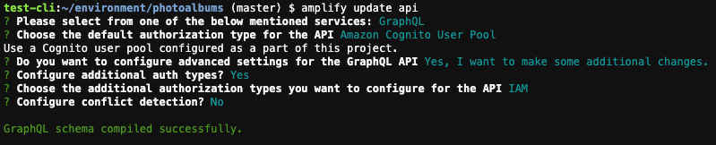 마찬가지로, AppSync GraphQL API를 처음 구성했을 때 Amazon Cognito 사용자 풀을 사용하여 요청을 인증하도록 구성하여 웹 앱 프런트 엔드에 인증한 사용자만 API와 통신할 수 있도록 했습니다. 이제 새 사진이 앨범에 업로드될 때마다 실행되는 서버 측 Lambda 함수가 있으므로 해당 함수가 API와 통신할 수 있기를 원할 것입니다. 위에서 S3 트리거 함수를 재구성했지만 Lambda 함수에 AWS의 Identity and Access Management 인증을 통해 API와 통신할 수 있는 권한이 있다는 지정만 처리했습니다. 클라이언트가 보조 인증 메커니즘으로 IAM을 통해 인증할 수 있도록 API를 구성해야 합니다. 이를 실현하기 위해,