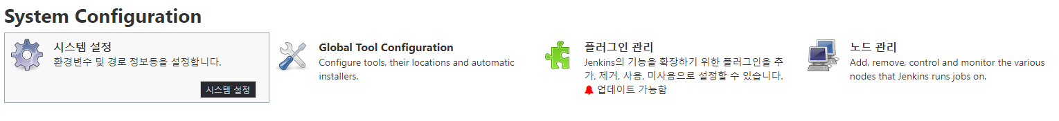 프로젝트가 생성되면 환경설정을 하기위해 Jenkins 관리를 선택 후 시스템 설정