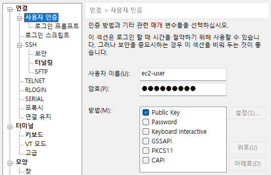 사용자인증에서 Public Key를 선택하고 설정을 누른다.
