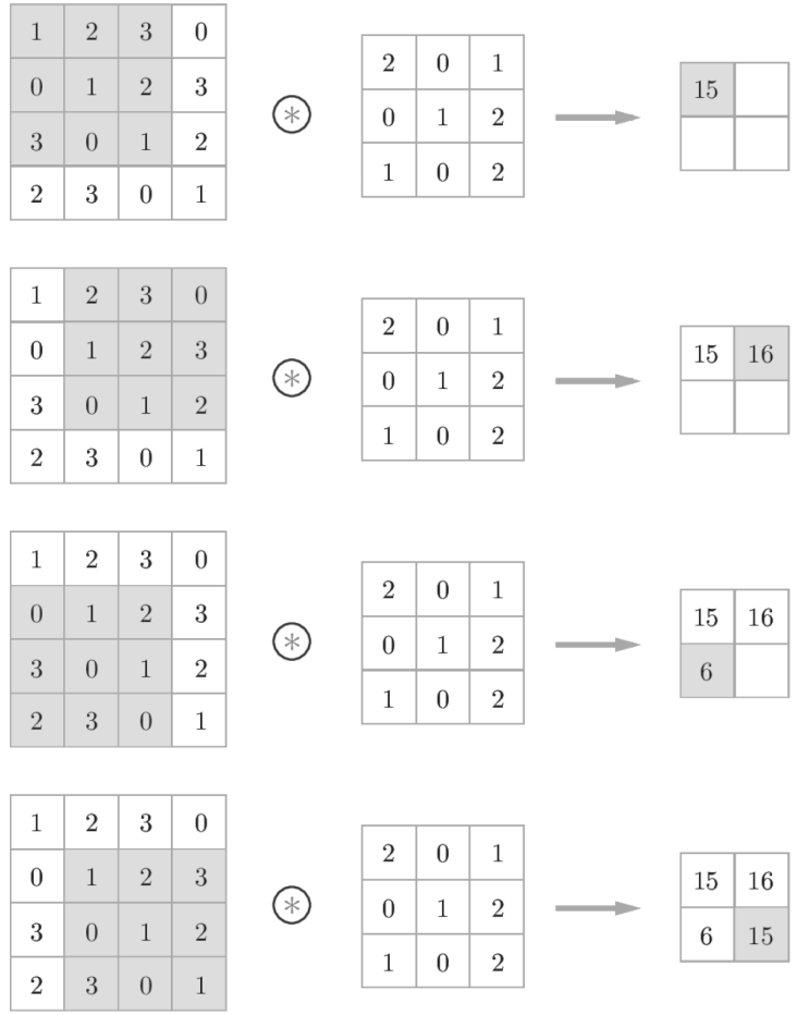 합성곱 연산은 필터의 윈도우(회색부분 3X3)를 일정 간격으로 이동해가며 입력 데이터에 적용한다.