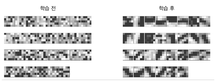 학습 전 필터는 무작위로 초기화 되어 있었는데 학습후 어느정도 규칙성이 있어졌다.