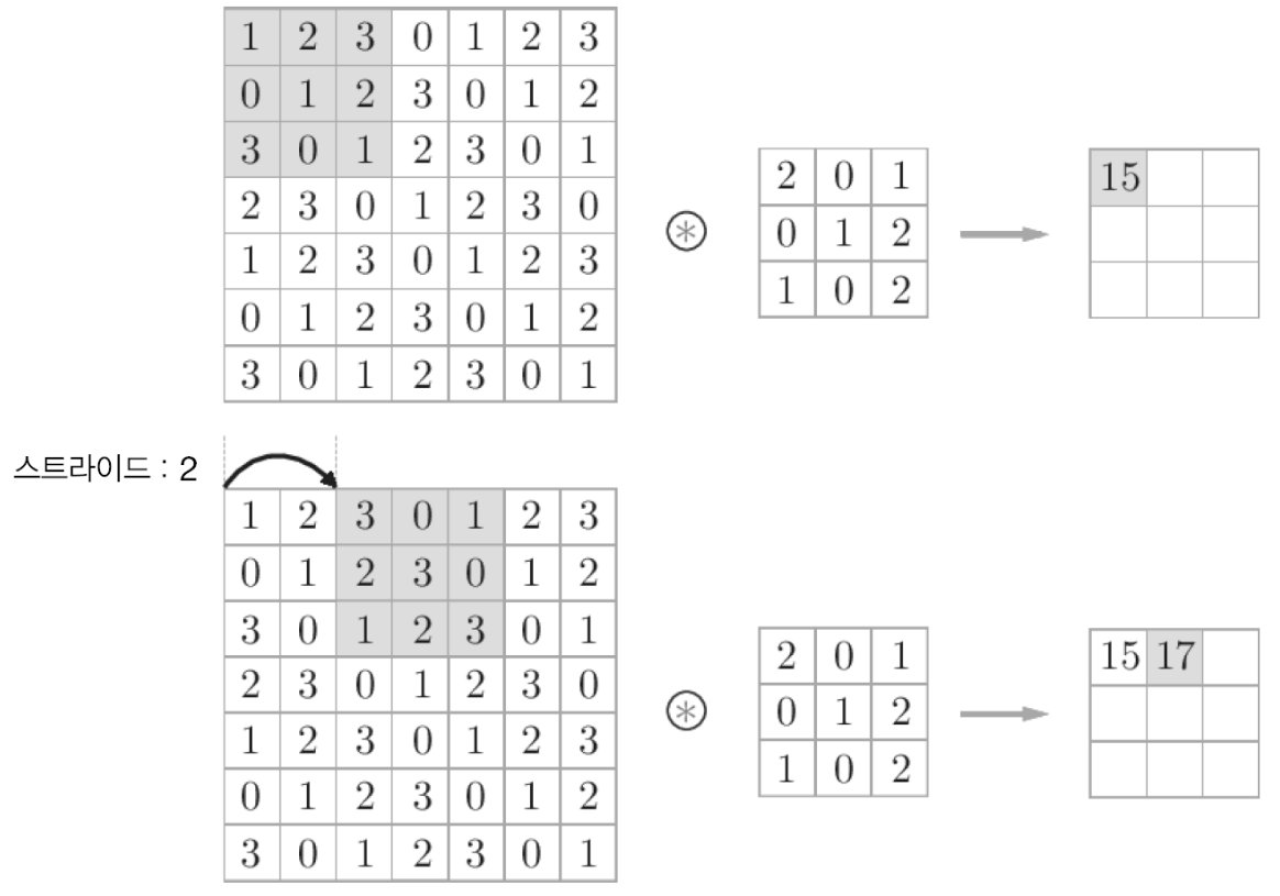 이처럼 출력 크기를 줄일때 스트라이드를 사용한다.