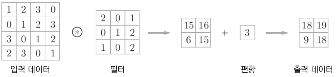 그리고 CNN에 편향이 존재하는데 위는 필터 적용까지만 보여주고 다음은 편향을 포함한 과정이다.