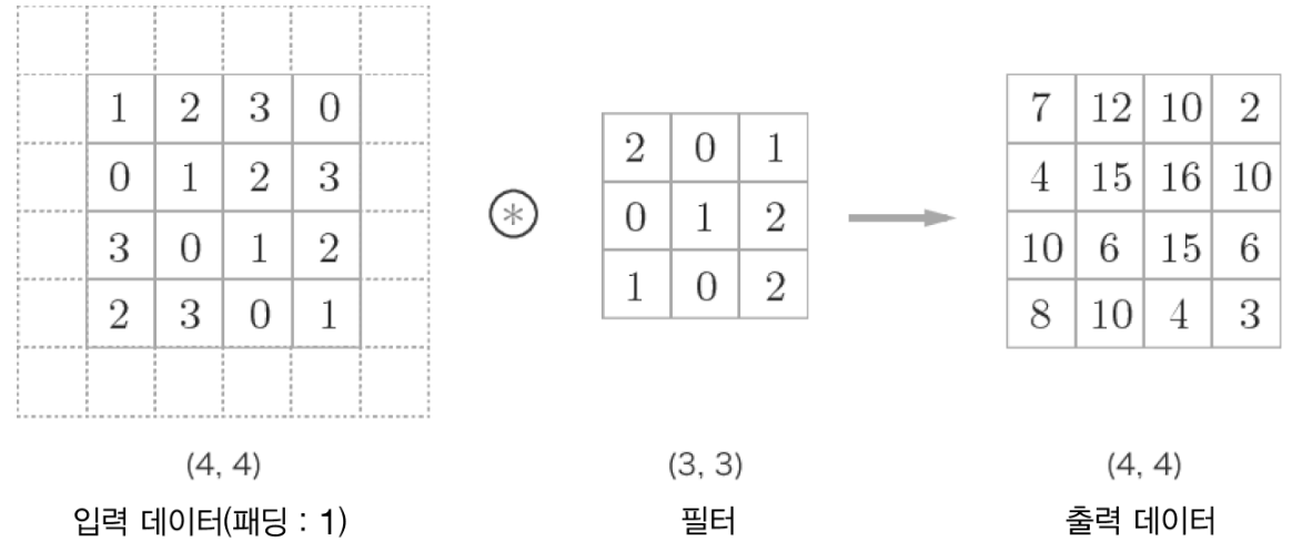 합성곱 연산을 수행하기 전에 입력 데이터 주변을 특정값(ex.0)으로 채우는 것을 패딩(padding)이라고 한다.