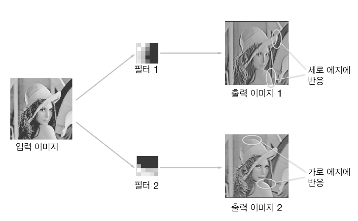 이처럼 합성곱 계층의 필터는 에지나 블롭 등의 원시적인 정보를 추출할 수 있다.