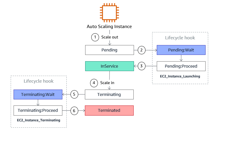 - 수명 주기 작업을 완료할 때까지 혹은 제한 시간(기본 1시간)이 끝날 때까지 인스턴스는 대기 상태로 유지됩니다. 수명 주기 후크를 완료하거나 시간 초과 기간이 만료되면 인스턴스가 다음 상태(Terminating:Proceed)로 전환됩니다.