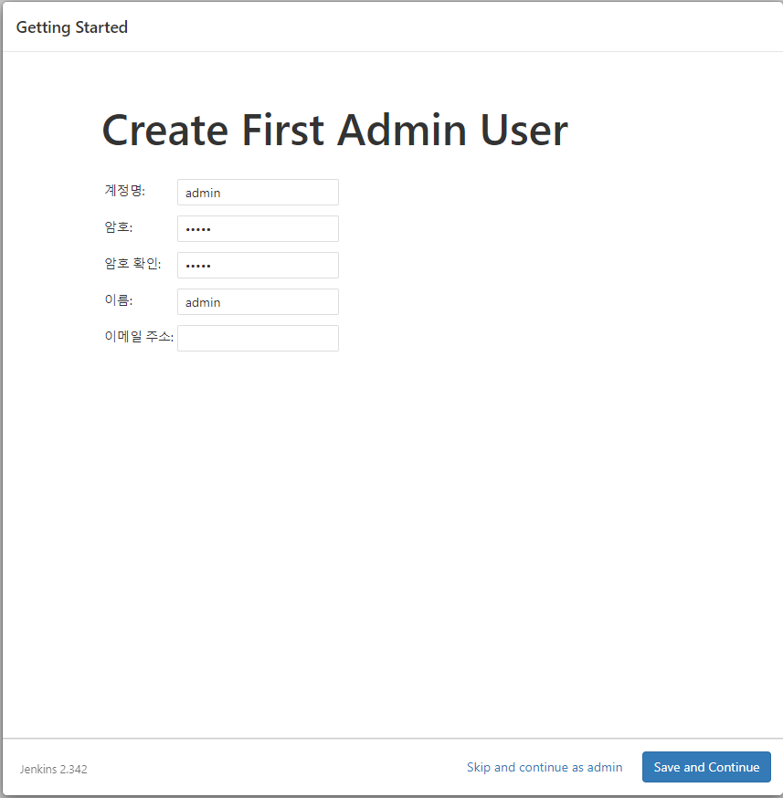 설치가 완료되면 admin 계정을 등록하라고 나옵니다.