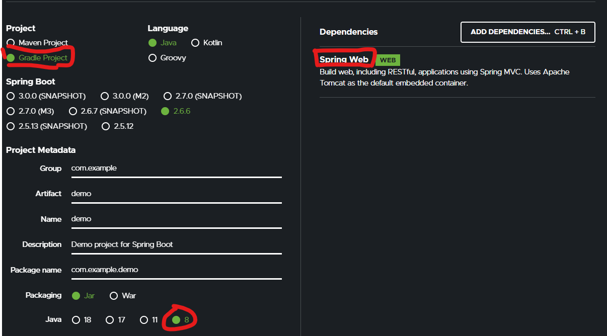 설정이 나오는데 project에는 gradle project, java 버전은 자신에게 맞게(저는 8), Dependencies는 ADD 에서 Spring Web을 선택하시면 됩니다.