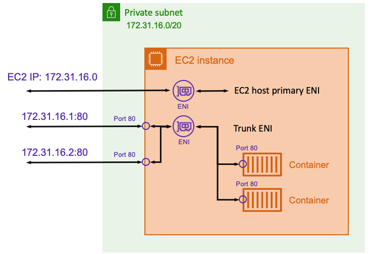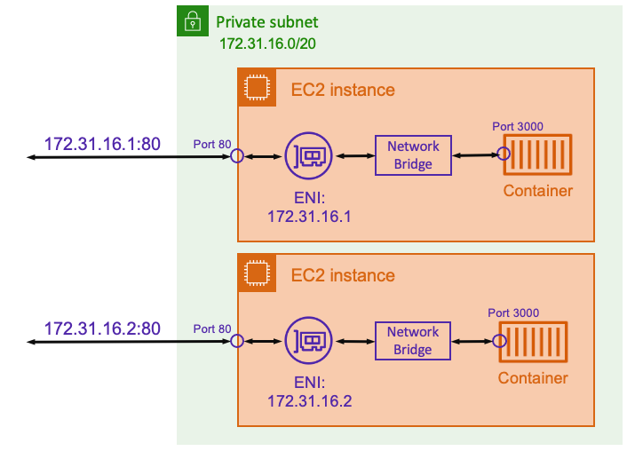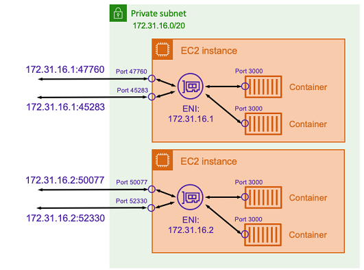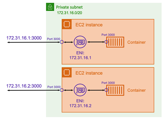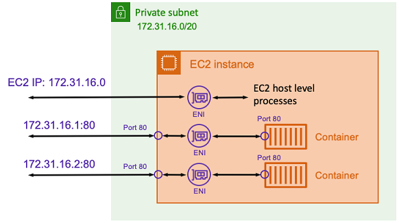 앞의 예에서 Amazon EC2 인스턴스는 ENI에 할당됩니다. ENI는 호스트 수준에서 네트워크 통신에 사용되는 EC2 인스턴스의 IP 주소를 나타냅니다. 각 작업에는 해당 ENI와 개인 IP 주소도 있습니다. 각 ENI가 분리되어 있기 때문에 각 컨테이너는 80태스크 ENI의 포트에 바인딩할 수 있습니다. 따라서 포트 번호를 추적할 필요가 없습니다. 80대신 작업 ENI의 IP 주소에 있는 포트로 트래픽을 보낼 수 있습니다 .