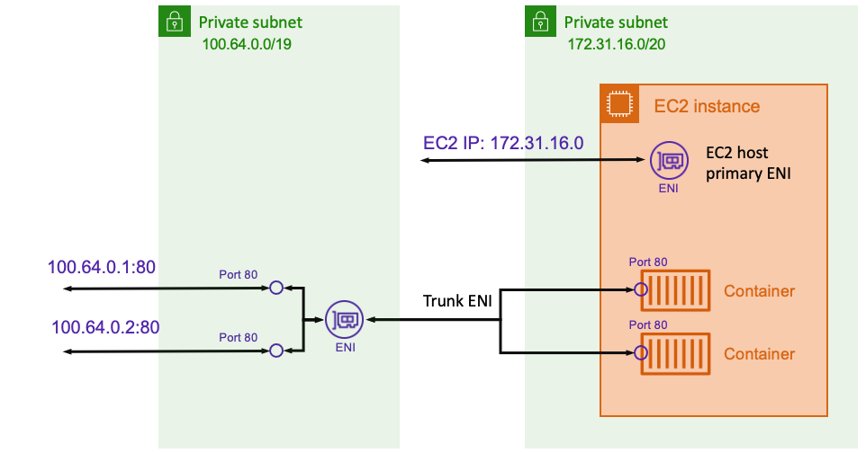 ENI 트렁킹을 사용하면 호스트와 다른 IP 주소 공간에서 ENI를 사용하도록 Amazon VPC CNI를 구성할 수 있습니다. 이렇게 하면 Amazon EC2 호스트와 작업에 겹치지 않는 다른 IP 주소 범위를 부여할 수 있습니다. 예제 다이어그램에서 EC2 호스트 IP 주소는 172.31.16.0/20 범위가 있는 서브넷에 있습니다. 그러나 호스트에서 실행 중인 작업에는 해당 100.64.0.0/19범위의 IP 주소가 할당됩니다. 두 개의 독립적인 IP 범위를 사용하면 너무 많은 IP 주소를 사용하고 인스턴스에 충분한 IP 주소를 남기지 않는 작업에 대해 걱정할 필요가 없습니다.
