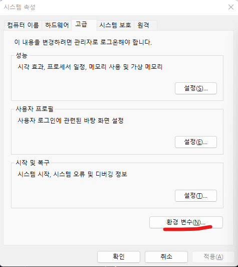 입력하면 시스템 속성이 나오는데 여기서 환경변수를 클릭