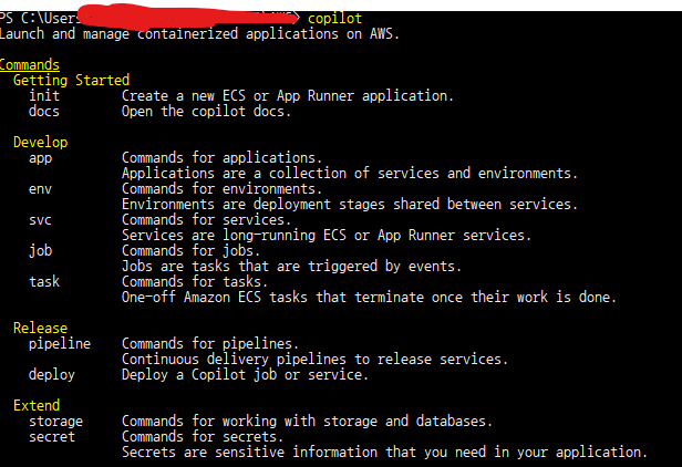 Invoke-WebRequest -OutFile 'C:\copilot\copilot.exe' https://github.com/aws/copilot-cli/releases/latest/download/copilot-windows.exe
