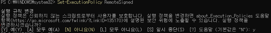 Set-ExecutionPolicy RemoteSigned 을 입력하면 아래와 같이 나오는데