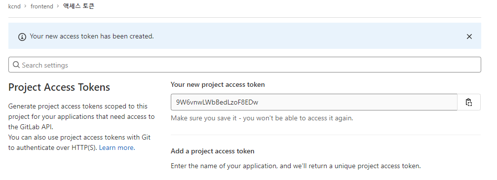 하면 token이 상단에 생성 됩니다. 그걸 복사하여 jenkins에 붙여넣기하시면됩니다.