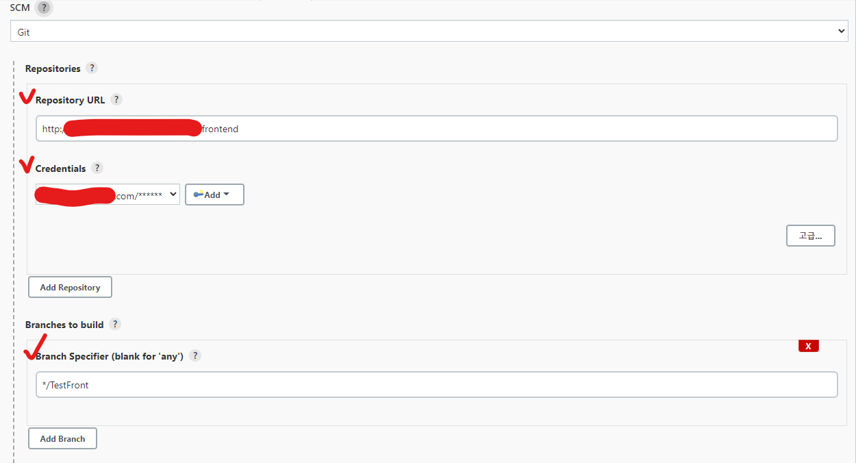 branch Specifier는 빌드할 브랜치를 입력하시면되고
