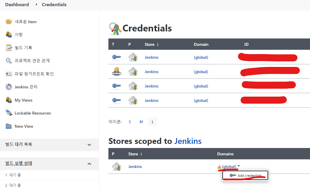 stores scoped to Jenkins에서 domain부분을 클릭한후 왼쪽탭에서 add credentials를 클릭하시거나