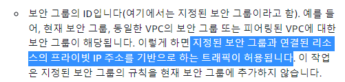 보안그룹에 보안그룹을 넣는 방식을 사용하길래 다를건 없고 ec2를 넣으면 프라이빗 주소 기반으로 허용이 된다고 하네요. (주소 입력할때 private을 사용해야겠습니다.) 포트는 관계없이 소스(ip)만 참조합니다.