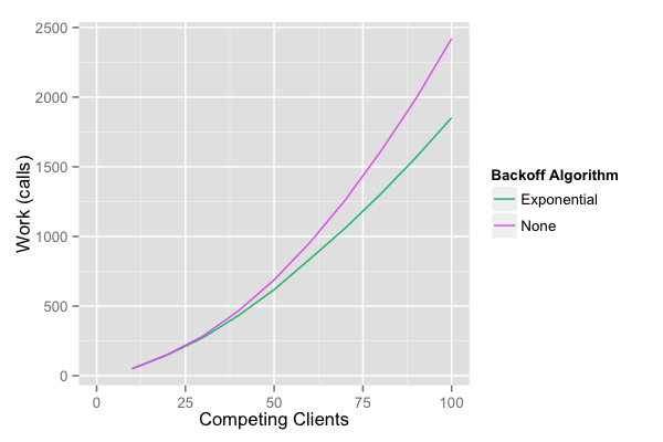 100명의 경쟁 클라이언트가 있는 경우 통화 수를 절반 이상 줄였습니다. 또한 지터가 없는 지수 백오프와 비교할 때 완료 시간을 크게 개선했습니다.